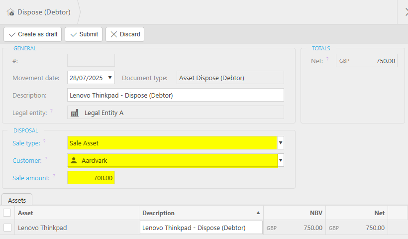 - Legal Entity - the Legal Entity that owns the Asset - selected, via the dropdown box, from the previously created Legal Entities.
