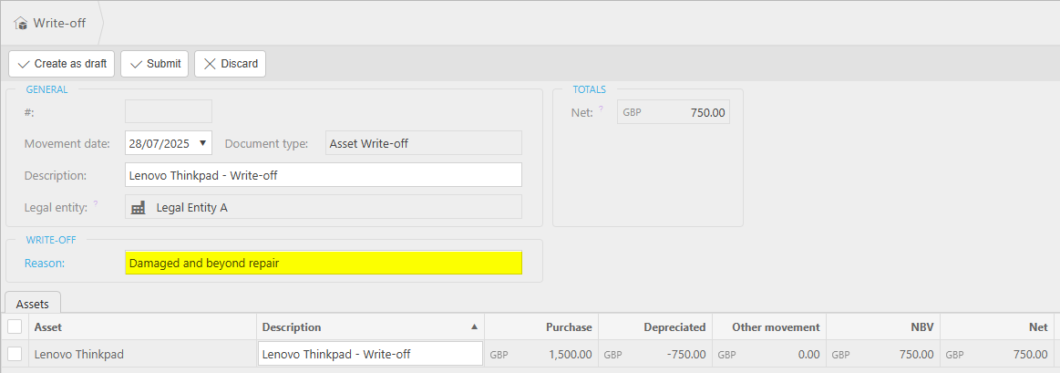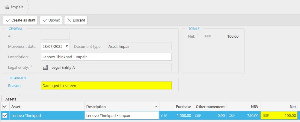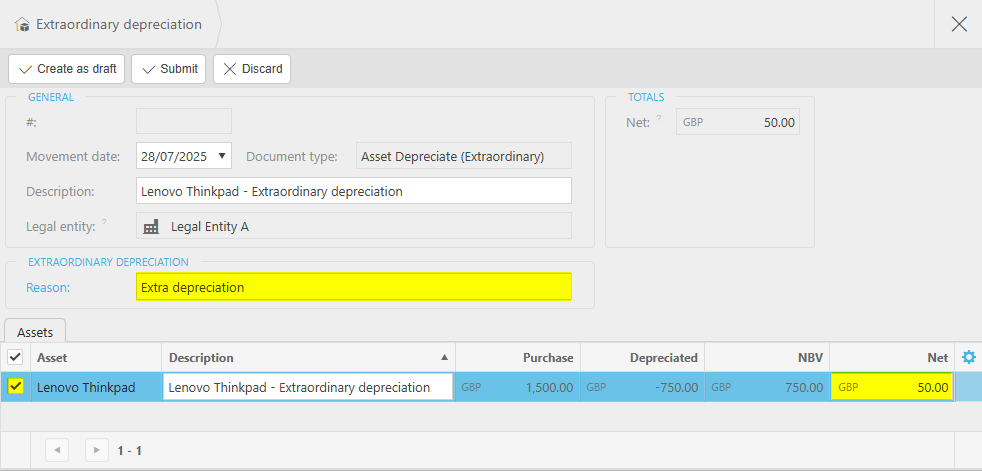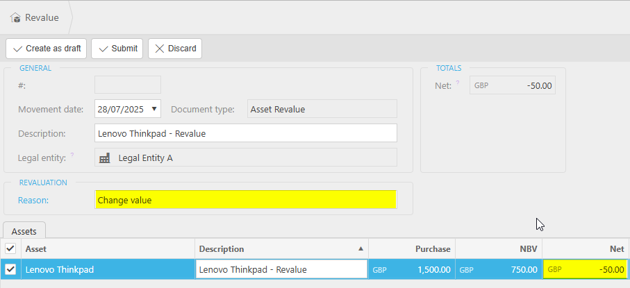Confirming the Uncapitalise, will then reverse any movements and journals that have been created and returns the Asset to a draft state.