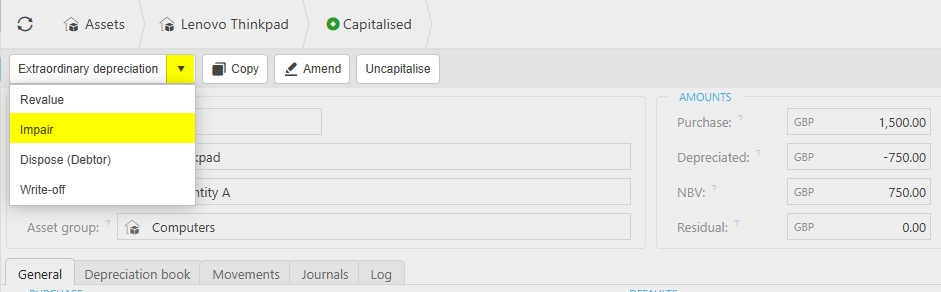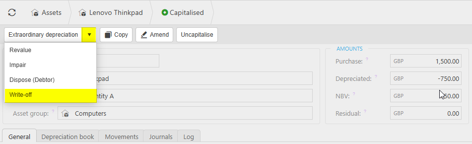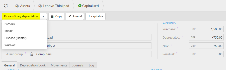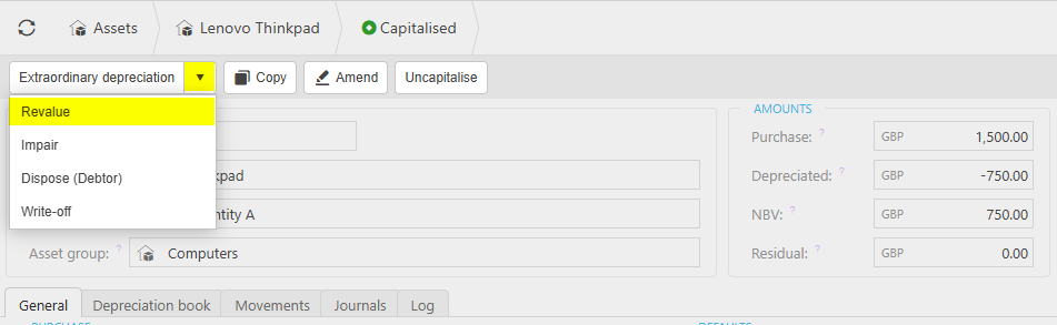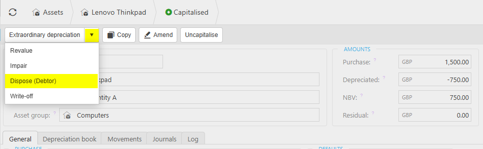 For an Asset to have any Movement against it, it must be Capitalised - that is it must be stated on the Balance sheet as an Asset - See step 6 in Creating an Asset above.