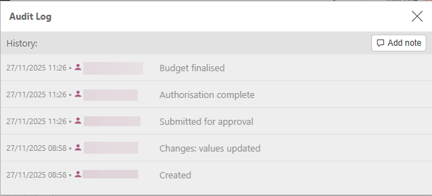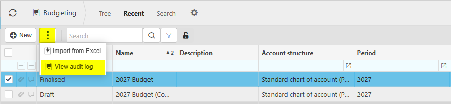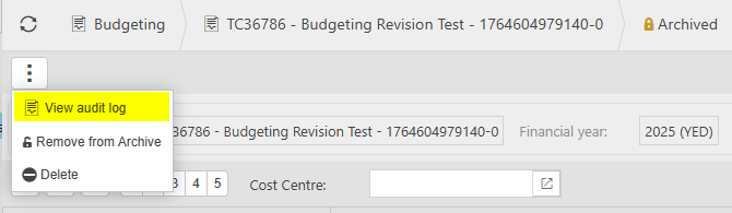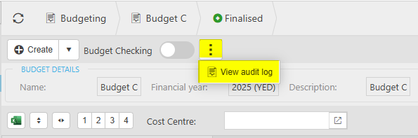 If the individual Budget is already selected and opened, then viewing the Audit log can also be seen via the