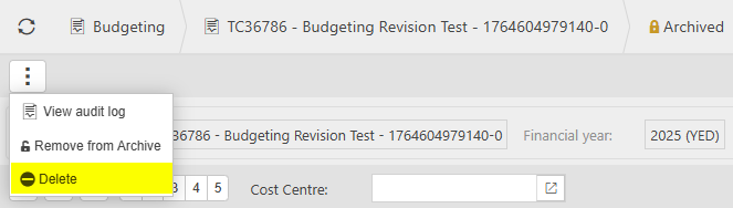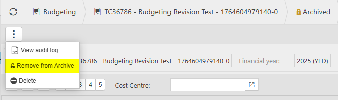 To remove the Budget from Archived state and return to Draft state, select Remove from Archive via the