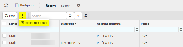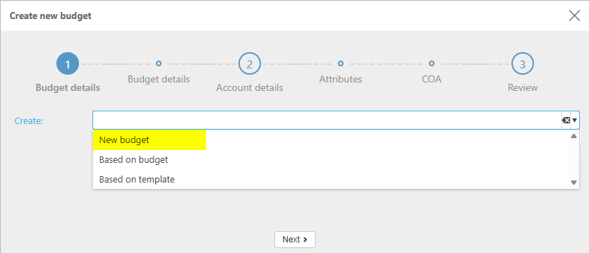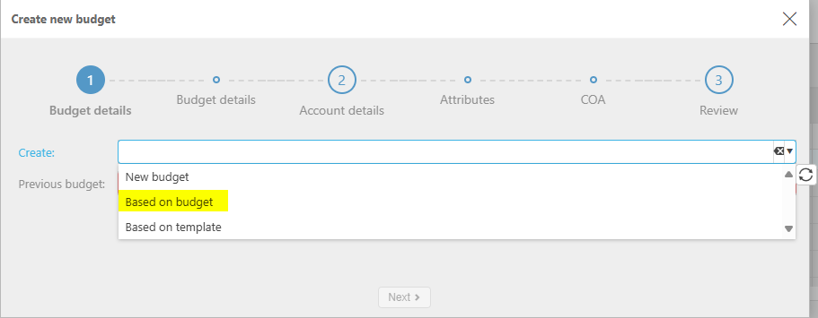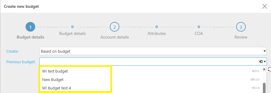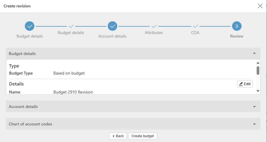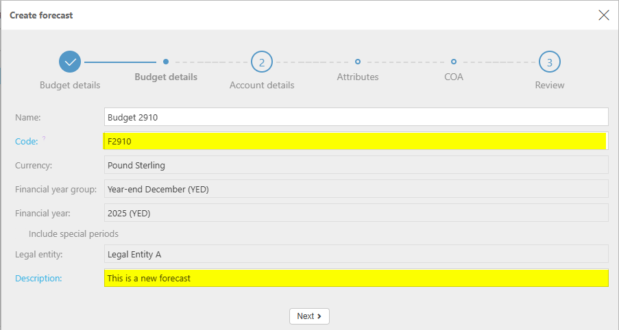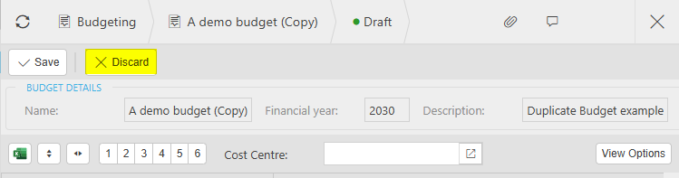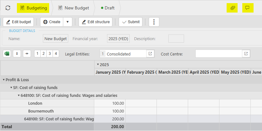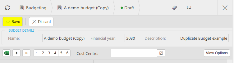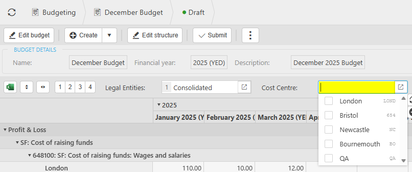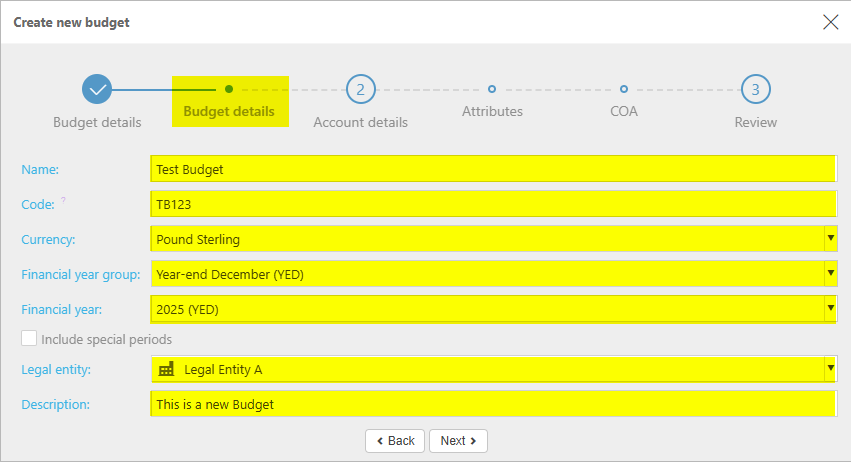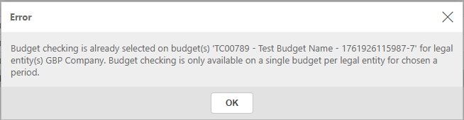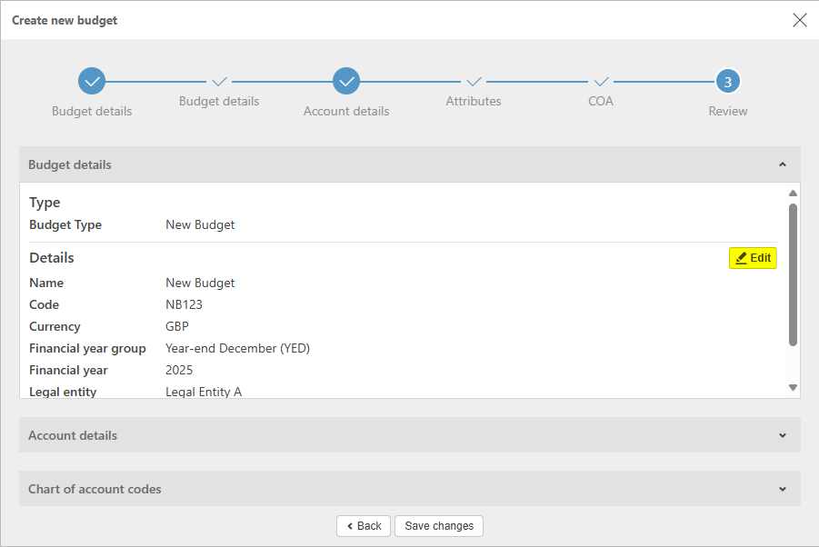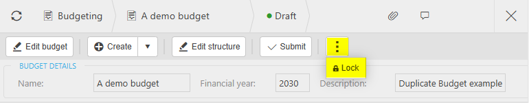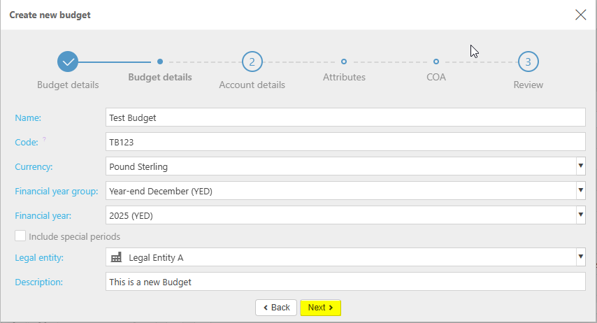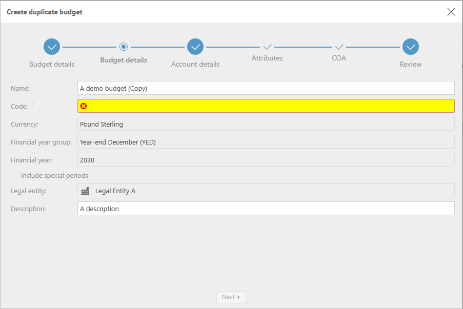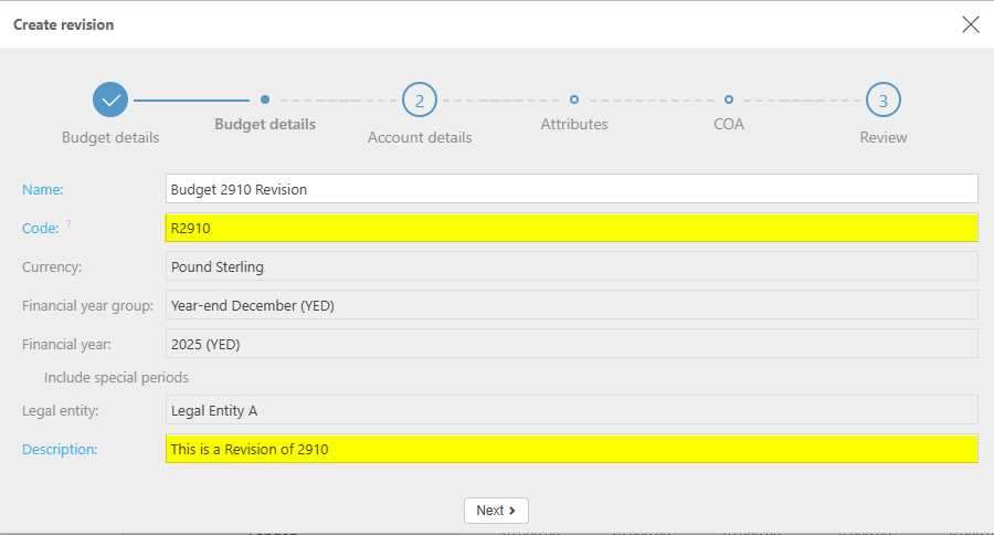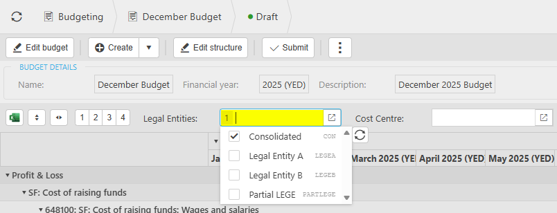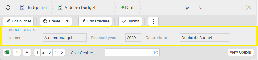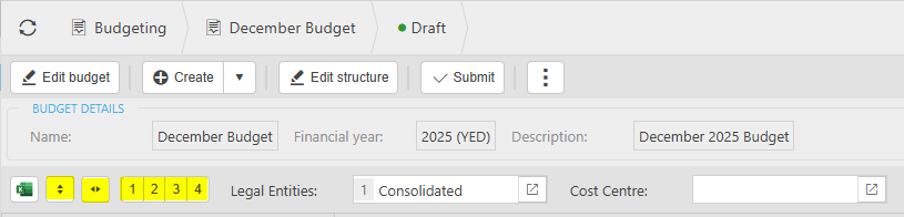The user will not be able to edit currency, financial year group, financial period or legal entity. A new budget will need to be created to update these items as data could be corrupted or lost depending on changes made.
