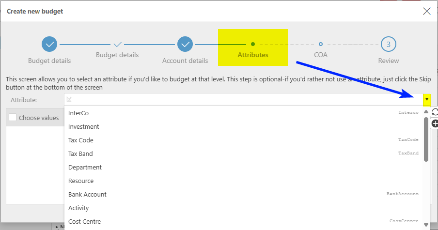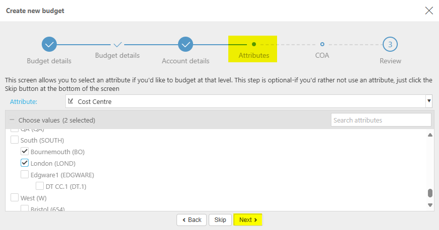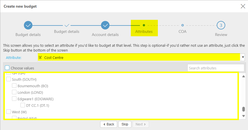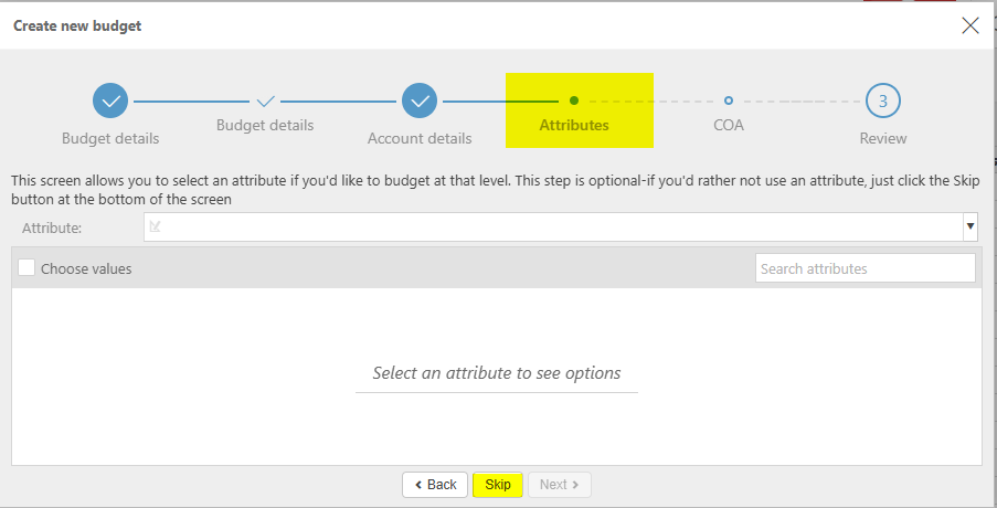 The next screen allows the selection of an attribute if required to budget at that level. This step is optional. Select Skip if no attribute is required.