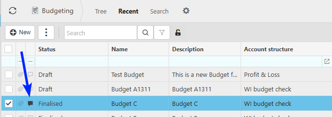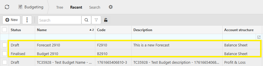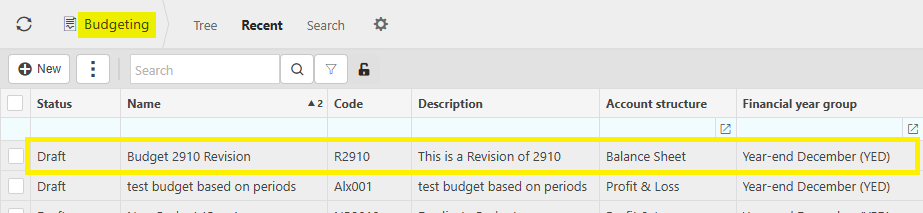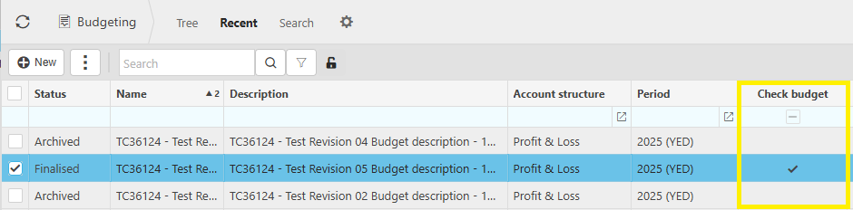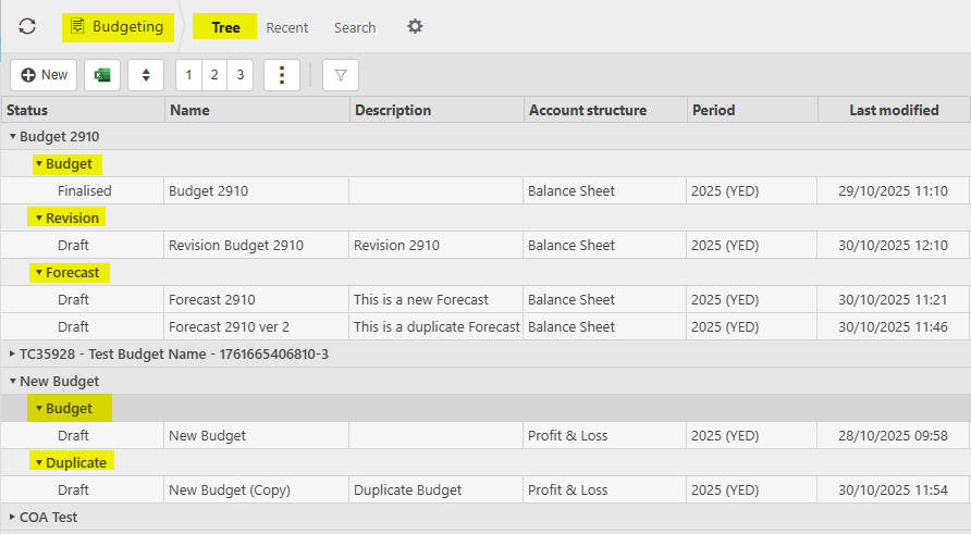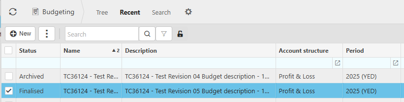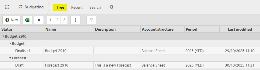 Selecting Tree will show a breakdown of Budgets along with any associated Forecasts, Duplicates or Revisions.