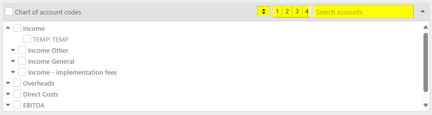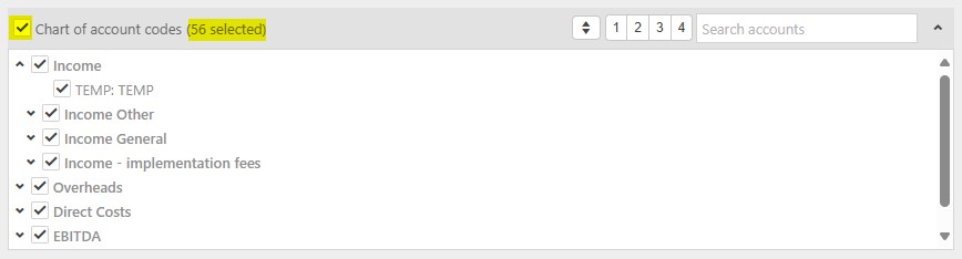 This includes a list of all nominal accounts that are not included in the top section and, by default, will be in a collapsed state. The number of nominals selected will be shown in brackets.