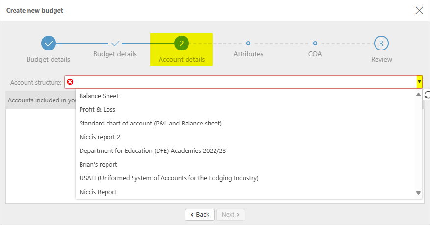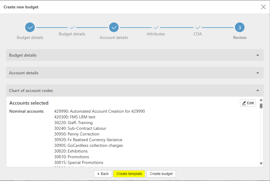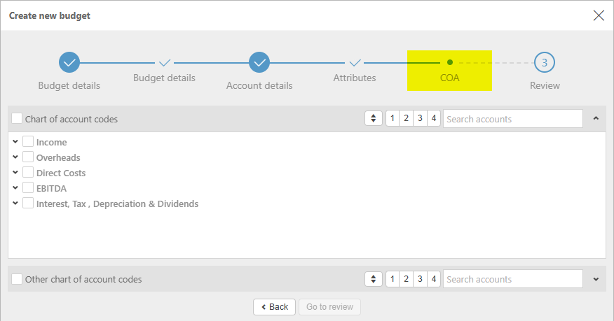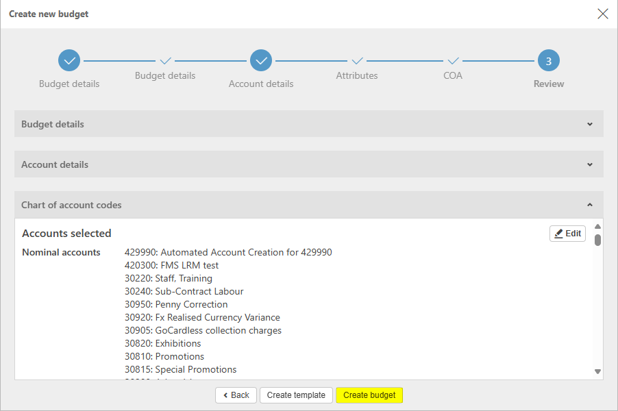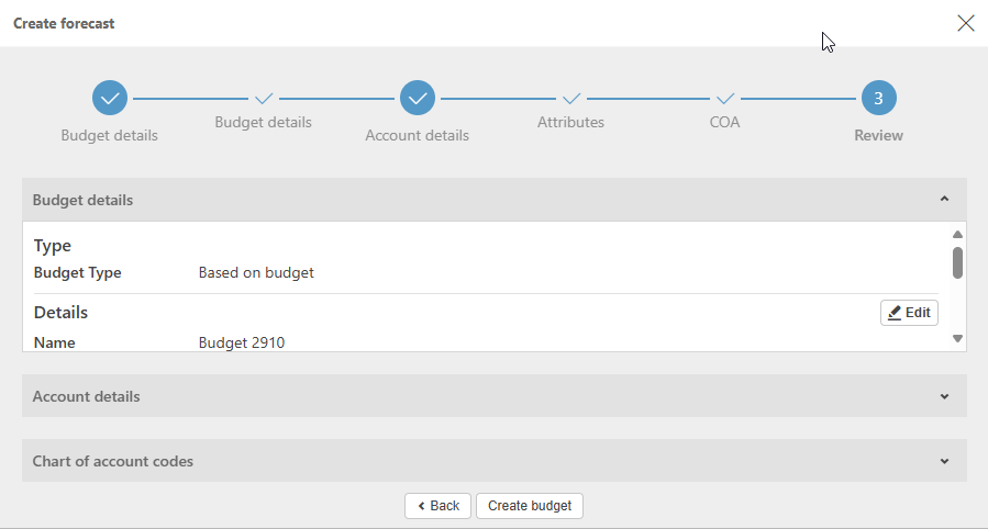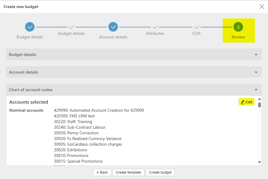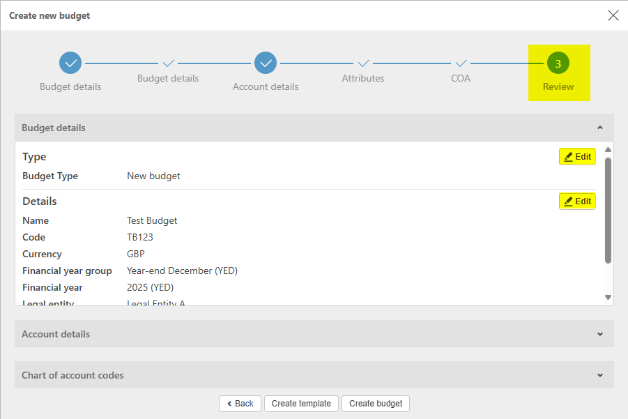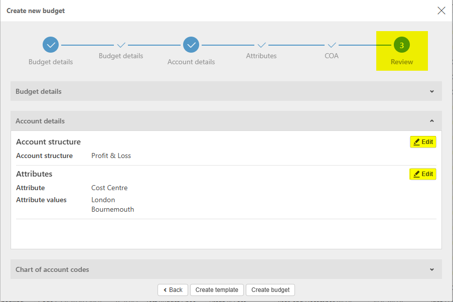 Progress through the wizard to edit values for Account details, Attributes and Chart of Accounts.