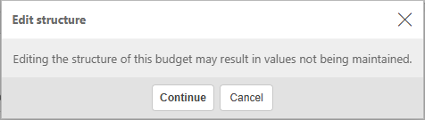 If the create budget had been completed and had values added to the input page but not saved, once the Edit structure option is selected the following warning message will show.