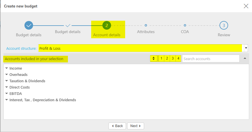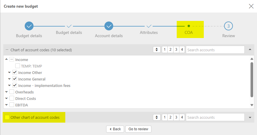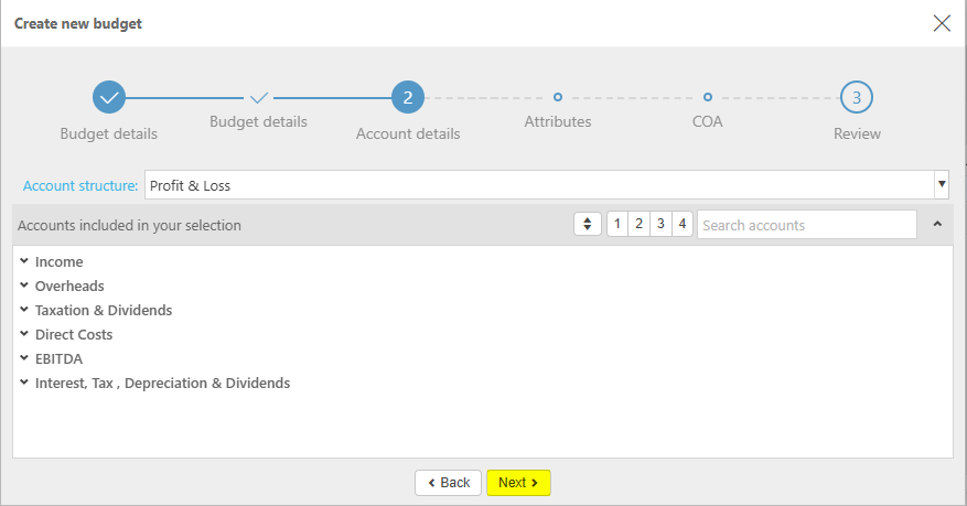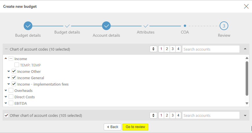 Select the nominal accounts to budget against, so that reporting can be consistent.