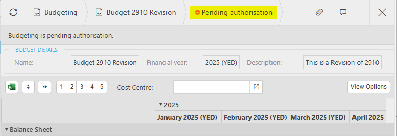 Submit: The Budget will be sent for approval as specified in the Authorisation workflows and will show as Pending authorisation.
