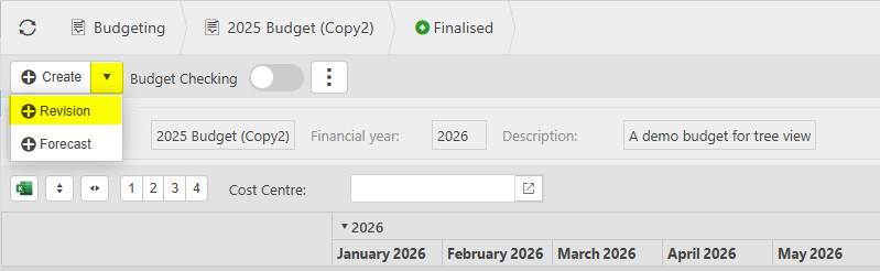 Creating a Revision from an existing Budget, so that changes can be made to a Finalised budget, and when approved will replace the existing Budget.