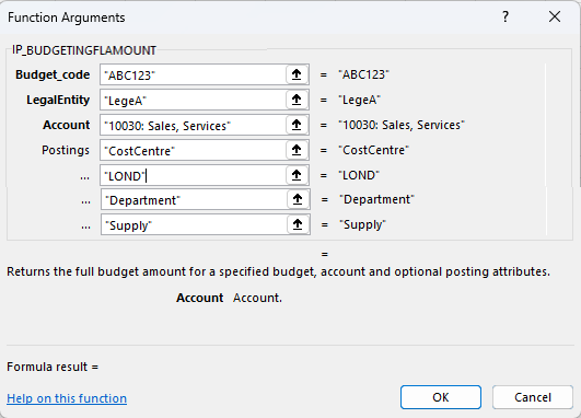 =IP.BUDGETINGFLAMOUNT("ABC123","LegeA","10030; Sales, Services","Cost Centre","LOND","Department","Supply")