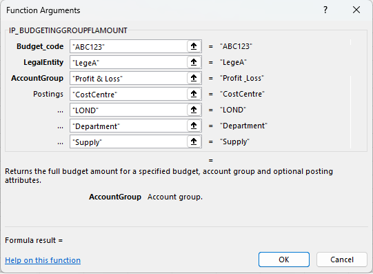 =IP.BUDGETINGGROUPFLAMOUNT("ABC123","LegeA","Profit & Loss","Cost Centre","LOND","Department","Supply")