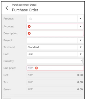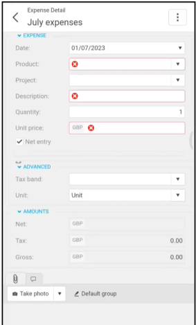 Press the highlighted line to open up the Line to enter Date of Expense, Product, Description, Quantity (default is 1) and Unit price. You also have the option to add or take a photo of the receipt.