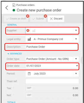 Enter Order header information - Supplier, Description and change or alter other fields such as Order Date.