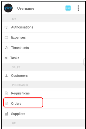 Purchase Orders are accessed from the main Mobile Classic App screen.