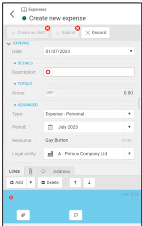 Use the Add, Copy or Delete options to add or remove more Lines. Use the Attach icon to add any Attachments or Photos (from your Mobile device). Also, using the bubble icon, you can add any notes or comments to the Expense Claim.