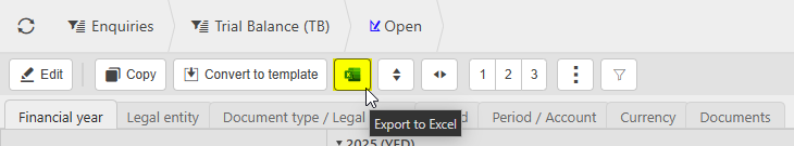 Export to Excel button, available in most enquiries and finders. This option generates an Excel file (.xlsx) that downloads automatically to your system.