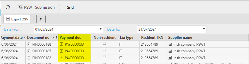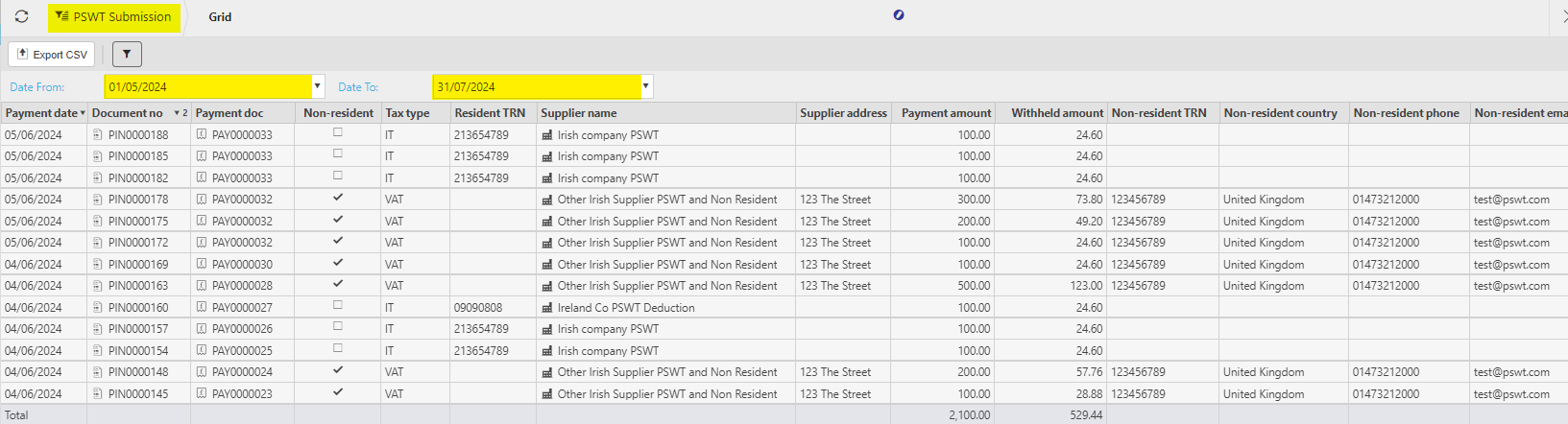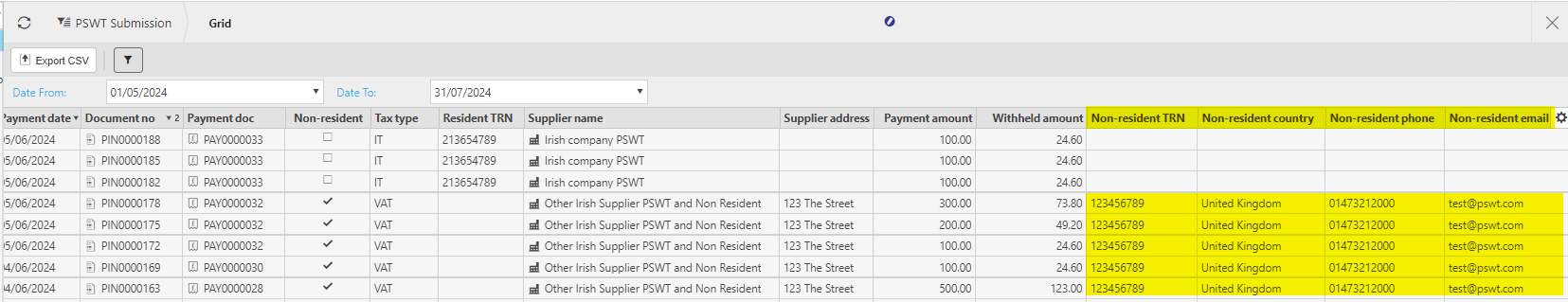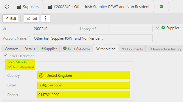 If the Non-Resident option is ticked on the Supplier, then the PSWT list above will have data in the Non-resident fields e.g.