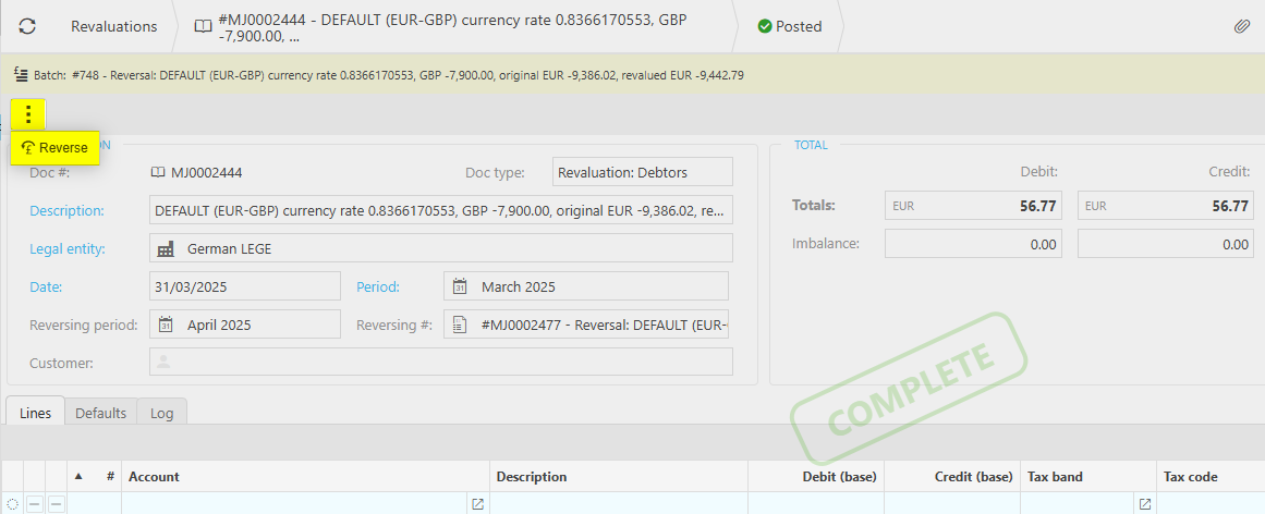 The Revaluation journal(s) and associated Reversal journal(s) (if applicable) will then be created, examples of which are shown below: