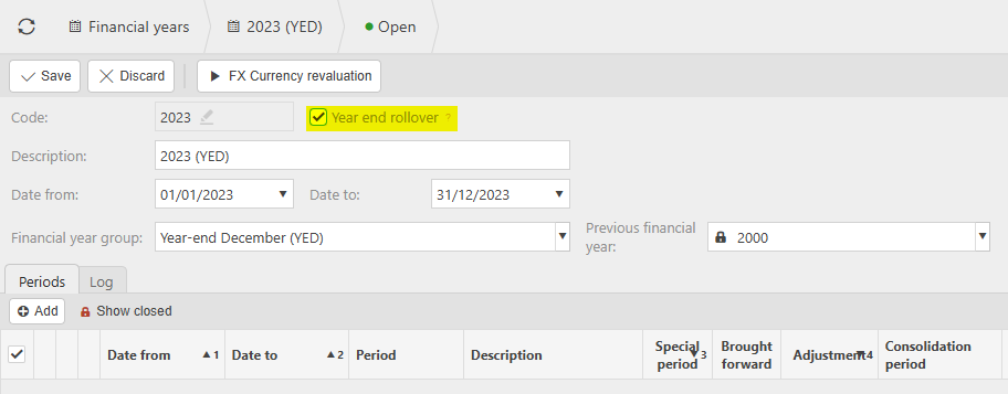 Document type: This is a "Periodicity" section in environment settings, period handling. Consider relaxing the posting attribute validation checks if you're not going to include all balance sheet posting attributes. Additionally, if the YERO document type is locked, unlock it and set it as the default here.