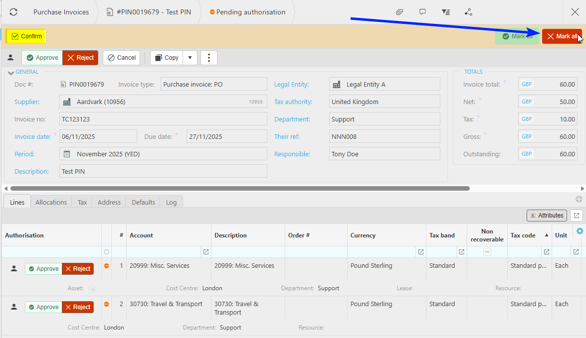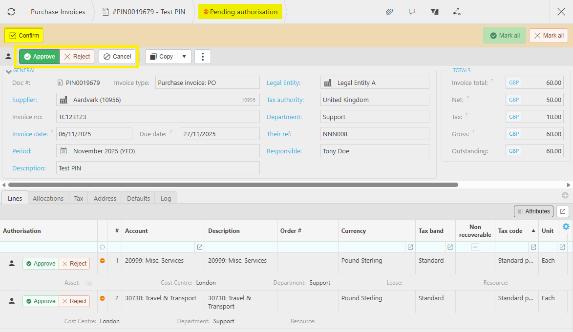Individual lines can also be independently Approved or Rejected, and each selection will need Confirming.