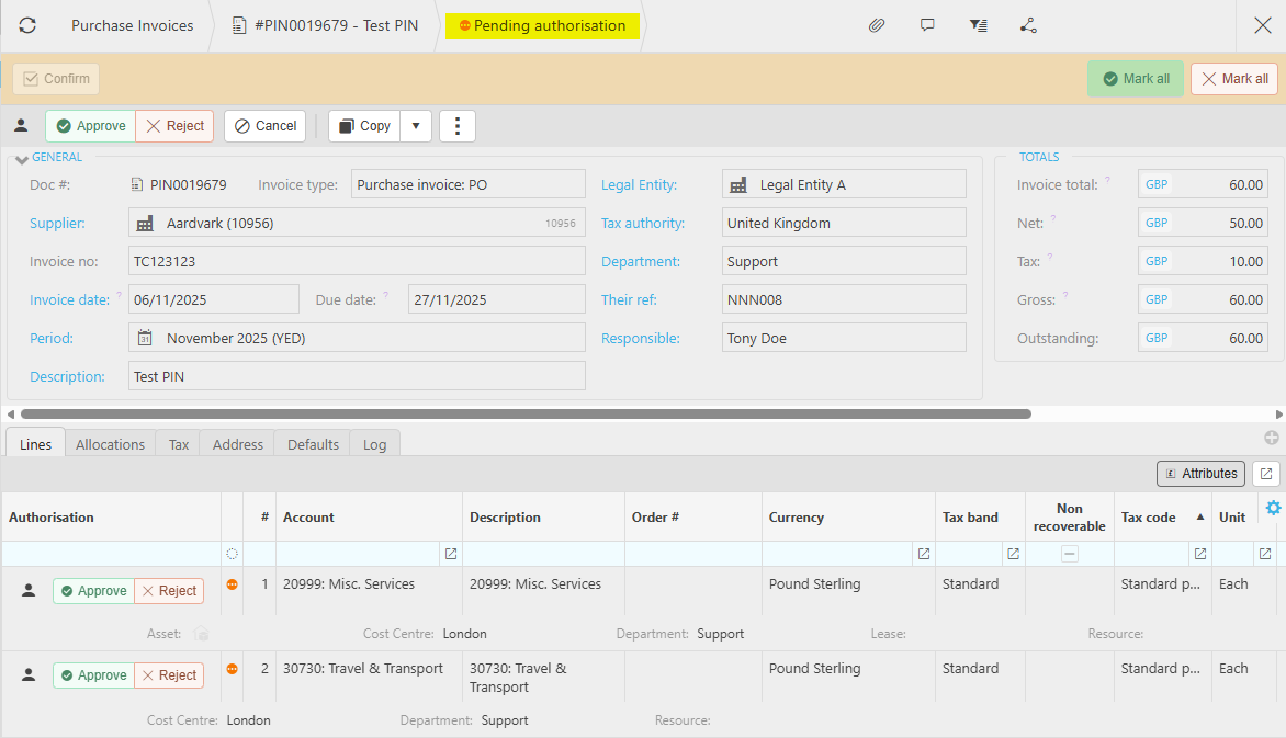 If an Authorisation Workflow has been setup, then the Invoice will be submitted Pending authorisation.