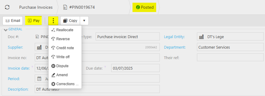 If no Authorisation Workflow has been setup, then this Invoice will be Authorised - see sections below for further changes etc. Also, the Invoice can now be paid - see How to pay a Purchase Invoice below.