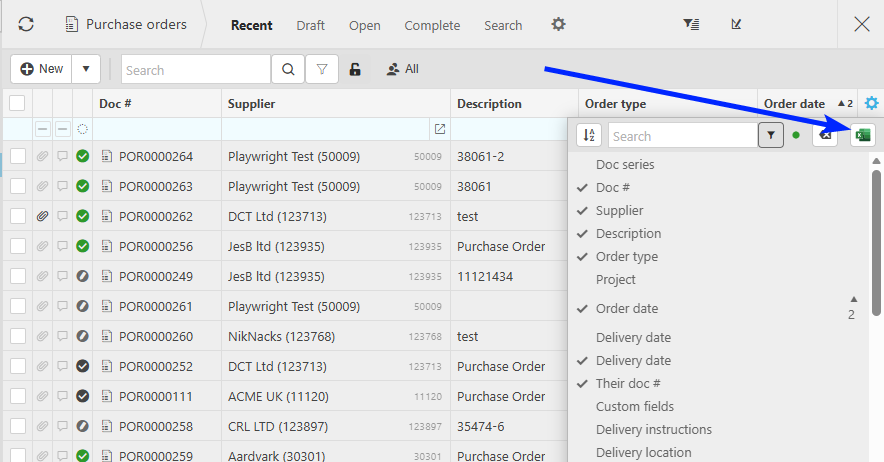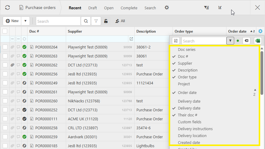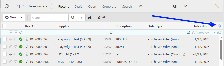 This will then show the Purchase Orders on the system where normal customisation of Sets can be used. Also, depending on User roles, the My/All option will be showing.