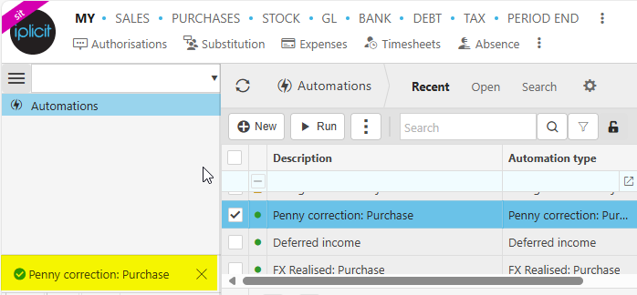 Automations can be run manually (e.g. accruals) or automatically (e.g. penny difference upon payment of a purchase invoice where the outstanding balance is within the penny difference tolerance).