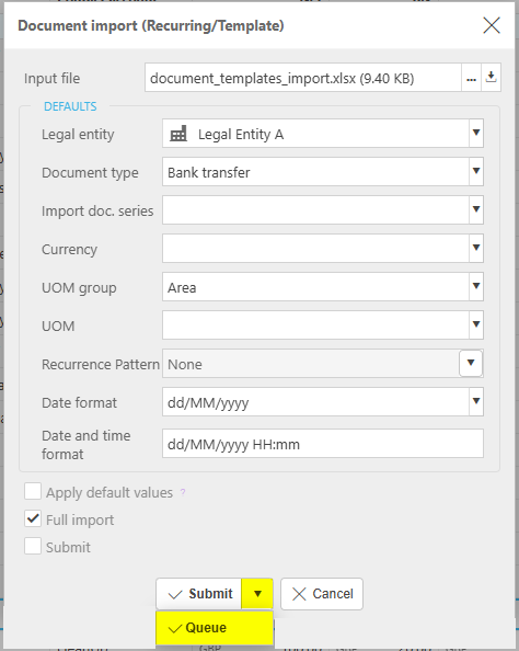 Selecting Queue from the dropdown option will queue the import process until other actions in iplicit are completed.