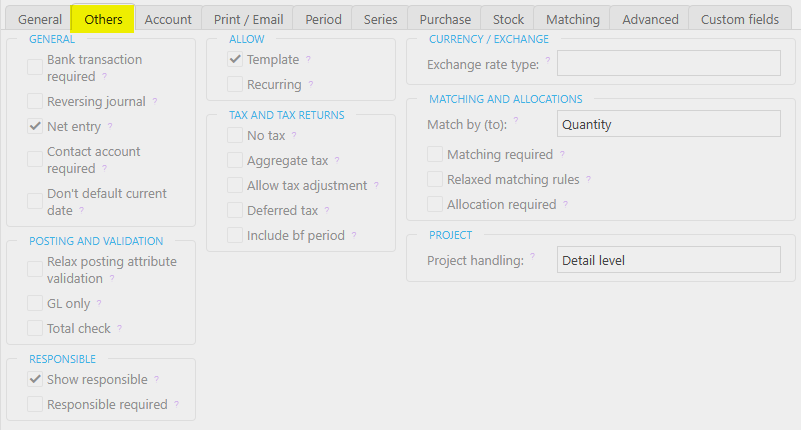 Credit entry: Credit entry can be ticked to allow users to enter values for credit notes, refunds and write offs as a credit. These document types will have different multipliers to their debit entry counterparts.