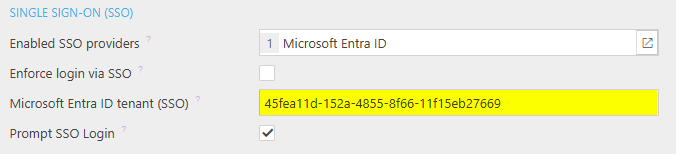 Microsoft Entra ID Tenant (SSO): This will populate with your Tenant ID which is found in the Office 365 Admin portal - Ask your office 365 Administrator to set this up.