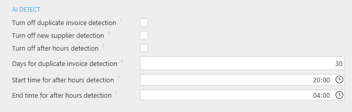 Turn off after hours detection: Tick to turn off the detection of invoices created after hours.