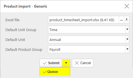 Selecting Queue from the dropdown option will queue the import process until other actions in iplicit are completed.