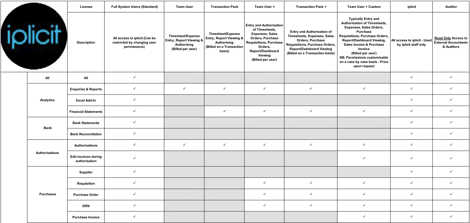 The following table shows the maximum permissions included for Team and Transaction pack user licenses. If more permissions are required than shown below, then the user should be considered a Full user.